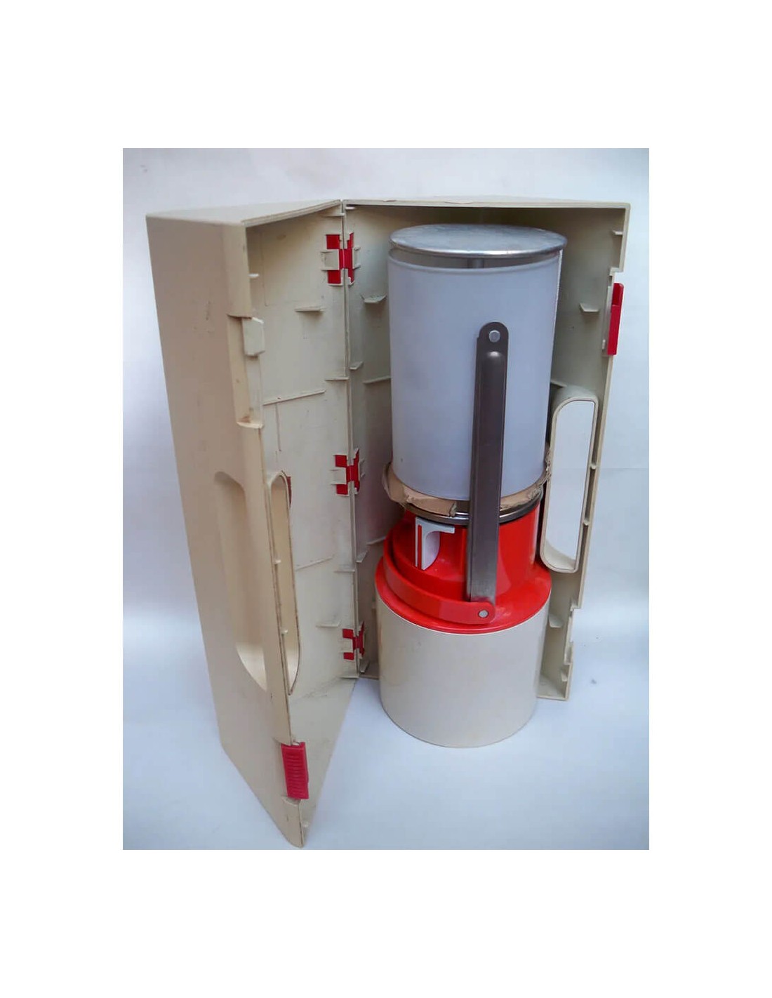 Farol portátil de camping a gas, con manija y caja transportadora.